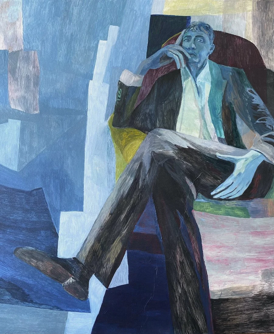 Young man on wingback, 2025, acrylic on stretched canvas, 1000 x 1000. available at artist's studio